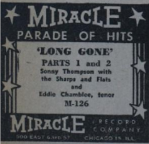 Miracle Records – like all companies in the waning days of 1947, as we’ve covered already – were in the midst of stockpiling songs to tide them over during the upcoming recording ban and as such they had an abundance of material to fill up their release schedule for the foreseeable future and so both tracks sat on the shelf awhile. Gladys Palmer, whom they’d backed the same day they’d cut Part One, along with the aforementioned Browley Guy from the Part Two recording date, as well as Thompson himself for other recently recorded songs, all got releases before they exhumed Long Gone in the spring of ‘48.