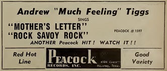 He had a decent enough song, or at least one with many of the right components and in Rock Savoy, Rock a title that was sure to at least alert the rock fan as to his intent, and Peacock even took out ads for it – though the Cash Box ad misspelled his name as Tiggs, while Billboard at least got it right, but once again he was done in by forces just out of his control.