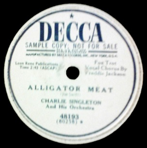 Since they were firm believers in covering every potential hit with their biggest stars, I think it’s pretty telling that Bing never laid down a version of Alligator Meat himself. Though don’t believe the rumors that when he heard this coming out of the next studio over he immediately sent back his steak and became a vegetarian. He may have disavowed rock – as Decca would continue to do for a long time, despite these occasional forays into it – but chances are if they thought this had hit potential he’d have been trying to wrap his baritone around its unsavory lines just the same.