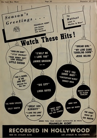 First off, that’s silly because it was the RIH single that made the local charts first. Secondly, like a few maddening labels, Dolphin didn’t sequence his releases strictly numerically. Instead he slotted them by artists, as evidenced by the ad itself which featured records spanning 101-246. The Cash Box ad in the December 27, 1952 issue (below right) similarly covered records spaced far apart but which were all recent releases. Heck, The Hollywood Flames already had releases in the 160’s during the summer of 1951, well before they’re claiming this record by Belvin was issued, so obviously that has no bearing on anything.