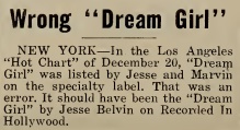 Though it probably didn’t matter in terms of telling us which SONG was the most popular, it definitely posed a problem when it came to determining which version of which song was most responsible for its popularity, especially when they were so different. In the case of Dream Girl the early returns throughout December all had the Recorded In Hollywood solo rendition by Belvin listed, but then Specialty’s began appearing alongside it, suggesting the combined sales or spins of the two were a contributing factor, before the papers started only attributing the popularity to Jesse & Marvin on Specialty.