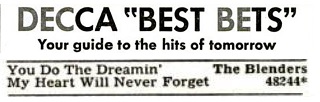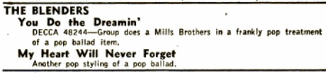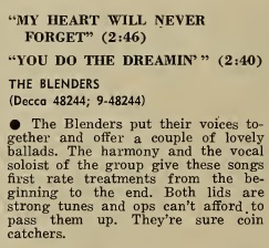 We know the backstory of these guys well enough by now to understand their stylistic dilemma as the music world at large came to grips with rock ‘n’ roll… how they’d formed in the wake of The Ravens upsurge when an early former member of that group put together these guys to take advantage of that popularity and after a decent first effort saw their chances for legitimacy compromised by the lure of opportunity as Decca Records came calling, seeing in The Blenders a chance to possibly get their foot in the door of this new market while still retaining the veneer of respectability in the process.