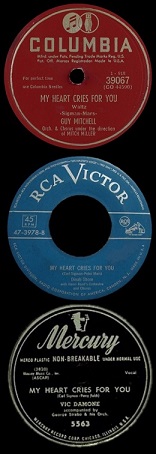 But they still seemed unsure of just what kind of music to pursue within that format. They’d had no problem doing secular material as The 4 Barons for Regent, but now they were sort of casting about for something when they decided upon a cover of the pop hit My Heart Cries For You, written by famed orchestra leader Percy Faith and a big seller for Guy Mitchell (#2), Dinah Shore (#3) and Vic Damone (#4) with many others slipping into the listings as well.
