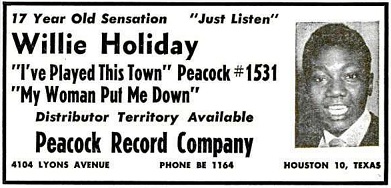 That Billie Holiday was a female and Willie was a male doesn’t make this quest any easier however, nor does the fact that Willie cut a rock single and the estimable Lady Day specialized in jazz. All we really seem to know is that Willie Holiday was 17 years old in 1950, had been discovered by a Houston disc jockey named Trummie Cain who used to hold weekly talent contests at The Lincoln Theater and that Holiday parlayed that brief moment of local celebrity into a one-off record for newly minted label Peacock Records.